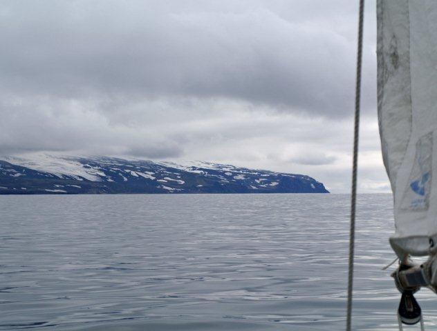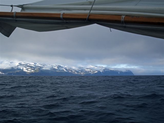 At this point I was undecided whether to go south via the east coast of Iceland, or to carry on with the third objective of the voyage – a passage through the Denmark Strait between Iceland and Greenland. Finally decided to go for the latter, so shaped a course south west to take us to the north west headland of Iceland, Stromnes. We reached here on Monday 20th July. In deteriorating weather we closed the coast and I eventually decided, somewhat against my better judgement, to enter Adalvik, Iceland’s most north-westerly bay, immediately to the south of Stromnes. Got into the bay, but despite a F6 north-easterly blowing outside, were totally becalmed for almost 4 hours, at the mercy of a mix of tides and currents evidently at work thereabouts. By this time I had given up all thoughts of sailing to the head of the bay to anchor. As soon as some wind finally came in we scooted offshore again as fast as possible. Had a good run down the west coast of Iceland in a cold north-easterly, the seascape dominated for two days by the Snaefellsjokull, the glacier at the end of the peninsula in central west Iceland.