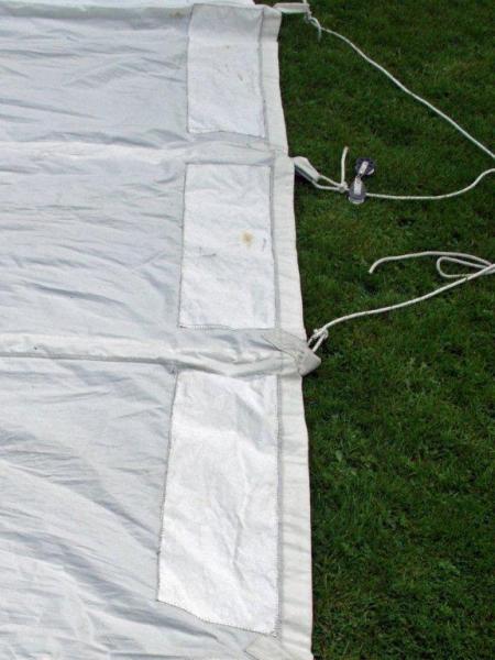 There have been the inevitable modifications to Mingming this winter, but nothing very major or photogenic. Below you can see a few photos of her new man-size chain-hawse, and her even more heavily patched mainsail (hand-sewn). The leech started splitting on the way back from the Davis Strait last year, so big patches have been added to discourage this!