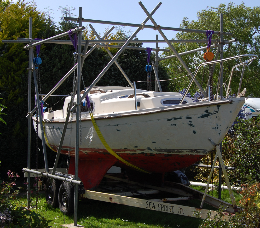 I needed to lift Sea Sprite off a rather rusty trailer so that I could begin a major refit and what I eventually came up with was the structure shown in the photographs, built from standard 48 mm scaffolding tube and fittings. It consists of twelve 8 foot poles, six 10 foot poles, one 11 foot pole, twelve 90 degree couplers, eighteen 360 degree couplers, four foot plates and four wooden boards.
