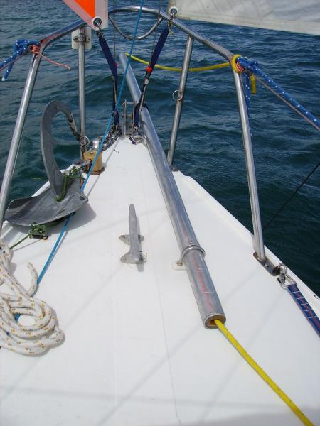 Our first bowsprit was part of the bottom half of a topper mast, lashed to the foredeck cleat and the bow roller. This served us for the ’06 season in the Clyde, but for the ’07 season we decided that this was too time consuming to lash on and a better solution was sought.