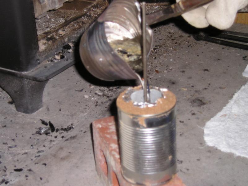This could be drilled afterwards, but it is far easier to cast it in place. This, along with the mould needs to be close at hand when you melt your lead. It will also make your life easier if you dip the rod in grease or oil before you cast the lead. The tin that you are going to melt your lead in needs a bit of modification. You need to bend a “spout” into it and also bend the edge over to get the pliers onto, nothing fancy here, see the picture. All that remains is to melt the lead and pour it into the mould. You can use almost any heat source, but the best two are a small camping stove or a blowtorch. Up here in Cumbria, we have an open fire and this also works quite well. Lead has a melting point of around 330 degrees, so it you don’t need that much heat. Just before you pour in the lead, you need to stick the rod down the centre of the mould and hold this straight with your spare hand (I advise wearing a glove as the rod will get hot) whilst pouring the lead in so it fills the mould.