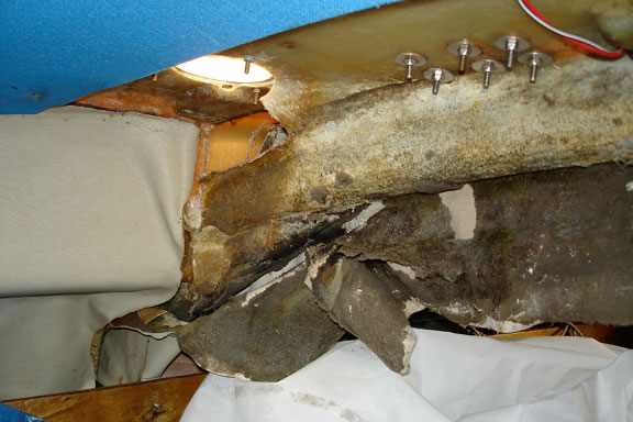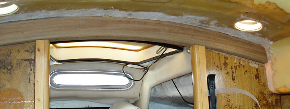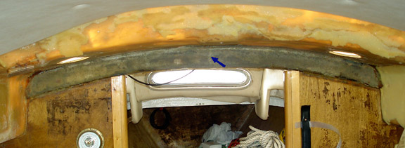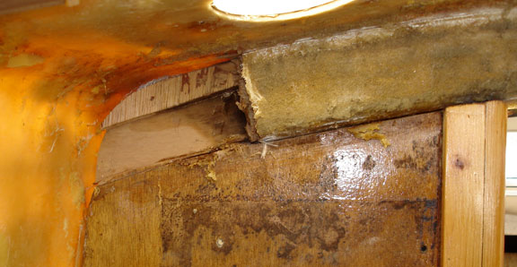 Looking inside, the problem is obvious – the grp laminate bonding the beam in place has failed, allowing the downward load of the mast deform the coachroof. (Thanks to Katie Miller for these three photos of Elektra).
