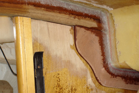 After cutting the grp, this beam was removed in sections with a mallet and chisel. There is evidence of water penetration even at the end of the beam. It is also apparent that the beam has been made from pieces of ply, not a particularly good example of boatbuilding joinery.