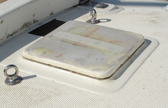 Below, a closer look shows where water has puddled (between the ventilator and the forehatch).