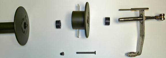 The furling drum (lower section) mounted on the fairlead/spindle assembly, showing the starlock washer ready to be pushed onto the spindle.