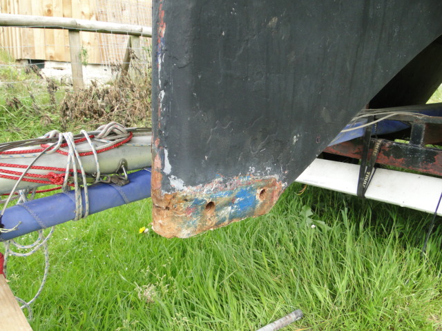 One member has met a different problem with his rudder. As it is skeg mounted it cannot fall off, but the internal cross members have given up, resulting in the rudder staying stationary when the tiller is moved. His proposed solution is to drill carefully through the rudder leading edge and the rudder stock, then insert studding or similar bars through the holes and down the internal length of the rudder blade. The holes in the leading edge will then be resealed to finish.