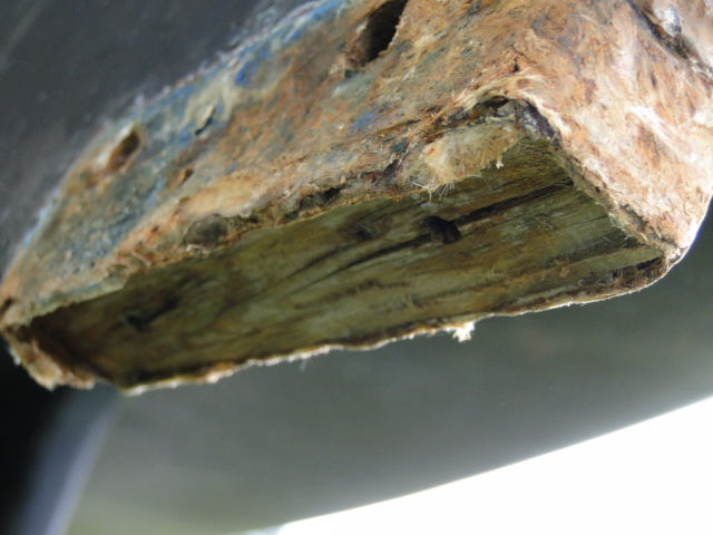I am pleased that I looked, not only because I found the corroded bolts, but because the skeg base was in fact exposed hardwood which was quietly rotting away. About 25mm or so was easily removed before I got to solid hardwood inside the skeg. For some reason, the base of the skeg hadnt been glassed over, probably becasue the pintle assembly would not have fitted if it had done. The hardwood seems to extend up into the skeg for about 200mm – easy to determine this by hammer tapping.