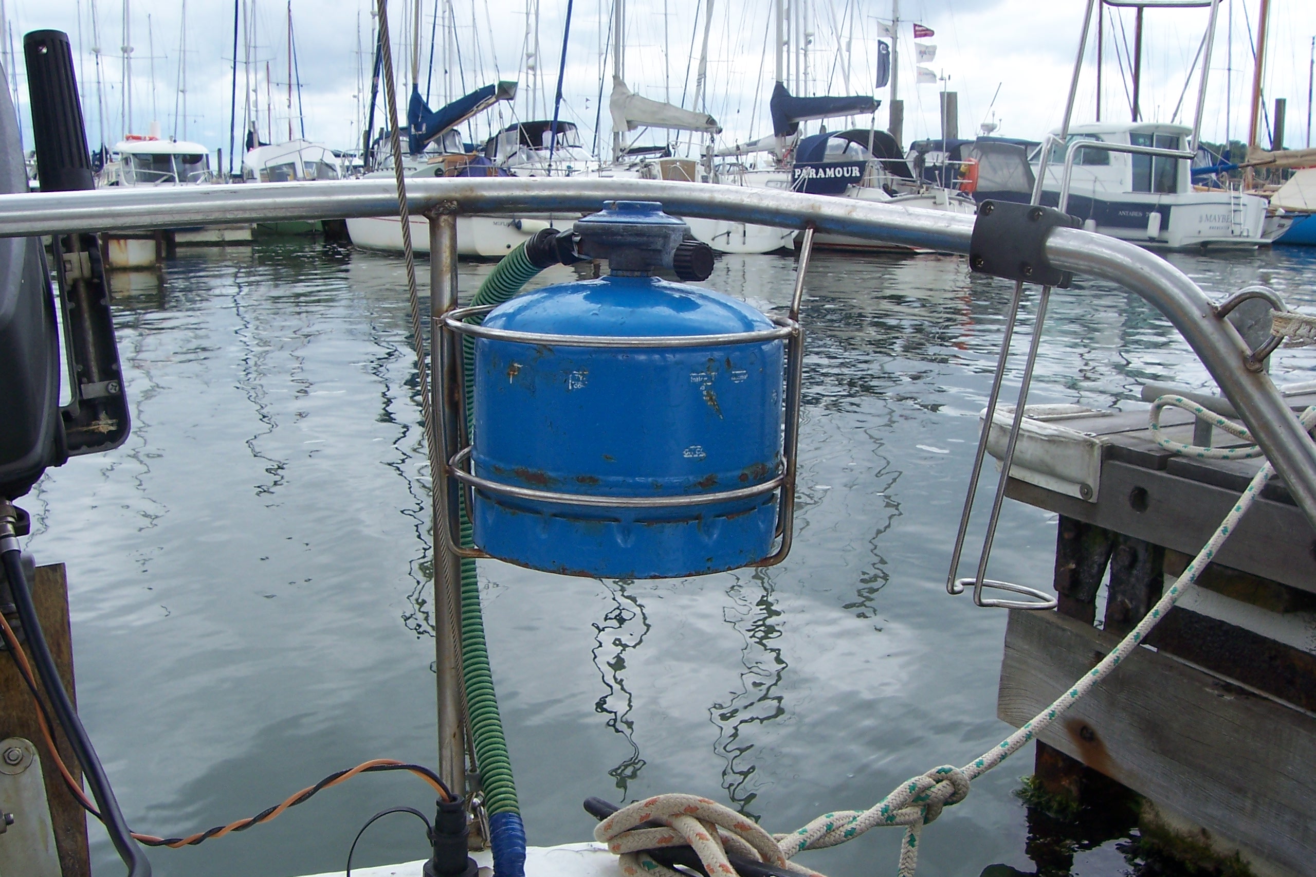 Although on Casulen II we had a double burner gimballed gas stove with a self-draining sealed gas box in the lazerette we decided to change it. The reasons behind this were that we never seemed to use more than one burner and the stove was getting suspect and needed regular attention, not a good sign for a gas stove on a small boat. Also the gas box took up a lot of room in the lazerette and we wanted to store a small outboard for the inflatable in there. We looked around at stoves and concluded that a fully gimballed Kuuma Seacook stove would fit the bill. The problem was that they didn’t appear to be for sale in the UK. Having exchanged a few emails with various US marine suppliers we still could not find out for sure if the European self sealing gas cylinders would fit and if not was there an adaptor available.