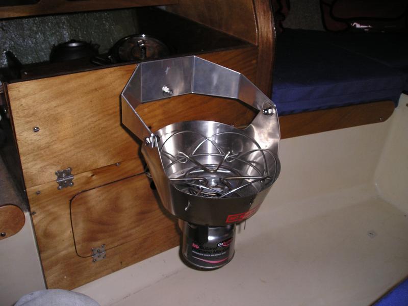 Please be aware there is a Safety Warning on use of the Self contained cooker of the type shown in the illustration. Apparently there have been fires etc. To do with fitting the cannister and also not turning the burner plate right way up. Not a thing I would want on my wee boat. Although gas can be dangerous – many many of us have sailed many miles with good maintainence and upkeep of a gas system. Like most things takie care of it and it will take care of you – EG rubber gas hose is date stamped – make sure you change it ! Leak test every year. Safe sailing.